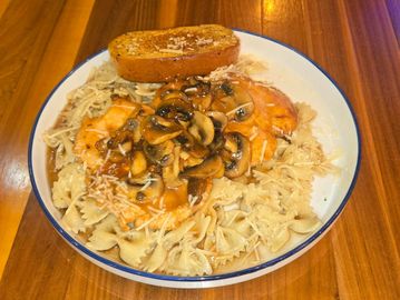 Bowtie pasta, mushrooms, Marsala sauce, garlic, and parsley. 18
