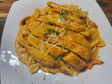Breaded chicken, bowtie pasta, bell peppers, mushrooms, onions, creamy Cajun sauce.