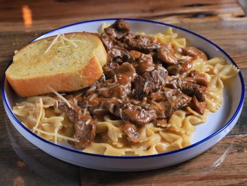 Bowtie pasta, mushrooms, onions, stroganoff sauce.