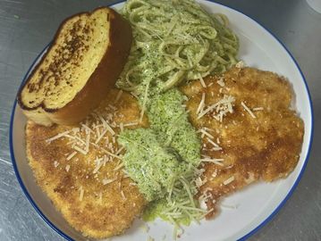 Breaded chicken, linguine pasta, parmesan cheese, prosciutto, and pesto oil as a garnish mix on top.